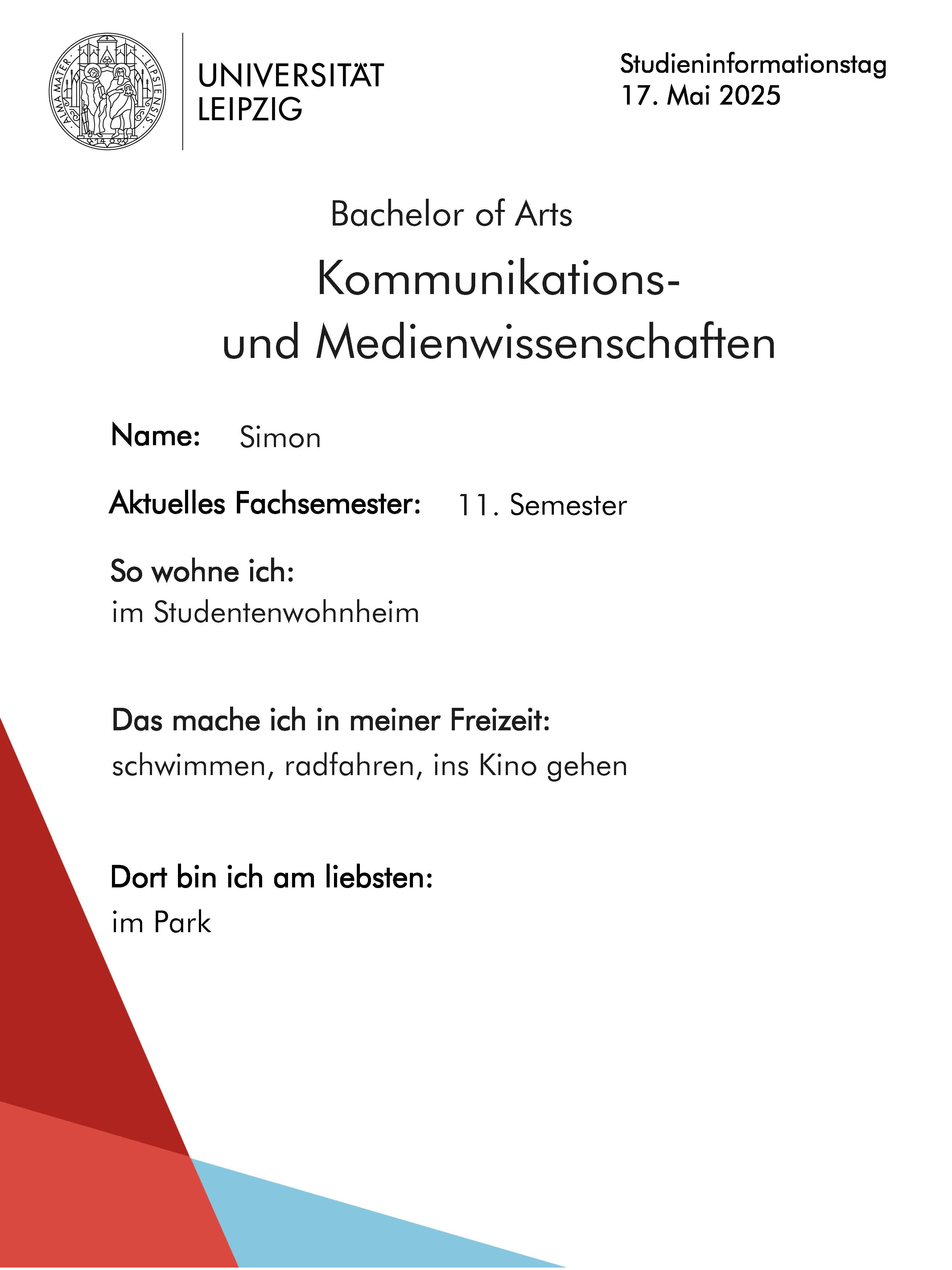 Aufruf Speed-Dating für den Leipziger Hochschultag am 09.05.2026 Liebe Studierende, in Vorbereitung für den Leipziger Hochschultag am 09.05.2026 auf dem Campus Augustusplatz suchen unsere Studienbotschafter:innen Emma, Emily, Vlada, Emil und Mark wieder freiwillige Studies, welche sich für 2 Stunden jeweils am Speed-Dating für unsere Besucher:innen beteiligen.** "klassisches" Studi-Speed-Dating ** - alle Studiengänge herzlich willkommen Hier werden den Studieninteressierten authentische Einblicke in Studienfächer und studentisches Leben ermöglicht werden, indem sie ihre Fragen direkt an Studierende richten können. Deshalb suchen wir Studierende aus allen Studien- und Fachrichtungen, die Lust haben am Speed-Dating teilzunehmen, um über ihre persönlichen Erfahrungen an der Uni Leipzig zu sprechen. Standort im Hörsaalgebäude Erdgeschoss direkt vor Eingang Uni-Bib** Lehramts-Speed-Dating ** Aufgrund des großen Interesses am Lehramtsstudium werden wir eine zweite, separate Speed-Dating-Strecke nur für die betreffenden Studiengänge anbieten. Dadurch sollen nach Möglichkeit alle Schulformen und Fachrichtungen vertreten sein. Wir freuen uns, wenn du Lehramt studierst und uns unterstützen kannst. Standort: vor dem Hörsaal 3 im 1. OG des Hörsaalgebäudes** Wann und wo? ** Der Leipziger Hochschultag findet am Samstag, den 09.05.2026 am Campus Augustusplatz statt. Wir laden alle Studierenden ein, in der Zeit von 11:00 bis 15:00 Uhr (in wechselnden Einheiten von 2 Stunden) das Studi-Speed-Dating zu unterstützen und mit den Studieninteressierten ins Gespräch zu kommen. Ein kleines Dankeschön wartet auch auf dich!** Rückmeldung und weiterer Verlauf ** Alle wichtigen Informationen und Details werden im weiteren Kontakt mit den allen Interessierten besprechen. Bei Interesse gebt uns bitte bis zum 28.04.2026 eine Rückmeldung mit den folgenden Informationen: • Vollständig ausgefüllter Steckbrief , siehe Mustersteckbrief • E-Mail-Adresse • Zeitslot bitte zwingend angeben: 11:00-13:00 Uhr oder 13:00-15:00 Uhr oder flexibel, dann teilen wir dich ein • E-Mail senden bis 28.04. an: studienbotschafter@uni-leipzig.de Bis Ende April werden wir einen entsprechenden Zeitplan auf Basis aller Verfügbarkeiten erstellen und dich anschließend über alle weiteren Details informieren. Für weitere Fragen oder Anmerkungen kontaktiere uns über studienbotschafter@uni-leipzig.de – wir freuen uns auf Eure Rückmeldung! Mit herzlichen Grüßen und Dank für Eure Unterstützung, Die Studienbotschafter:innen und das Team der Zentralen Studienberatung
